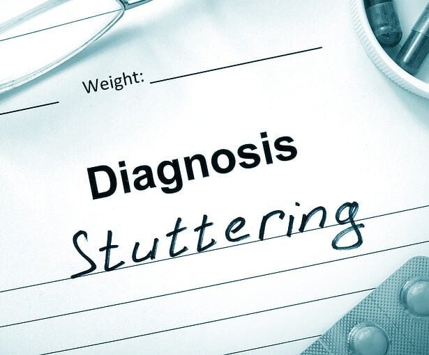 Diagnosis Stuttering and tablets on a wooden table.